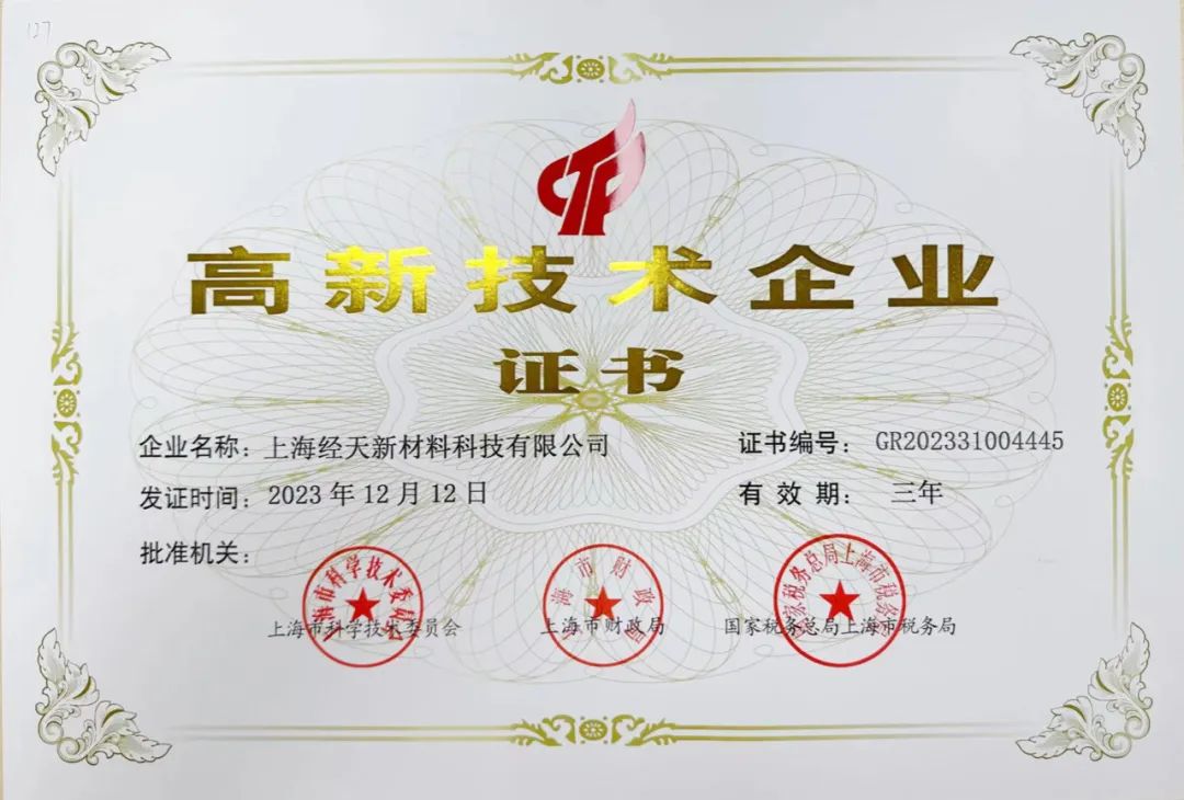 上海经天新材料科技有限公司再次荣获国家“高新技术企业”认定,标志着我们在新材料科技领域的科技实力和创新能力获得了充分肯定和高度认可,这不仅是对上海经天过去成就的见证,更是对未来发展的期待和鼓励。